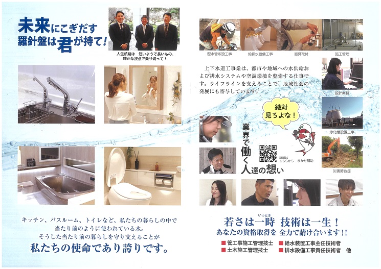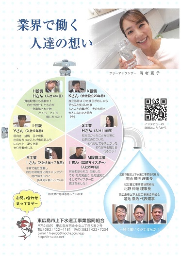 東広島市上下水道工事業協同組合様が、「管工事業」について、親しみやすく身近に感じてもらうため先日のYouTubeと合わせてリーフレットを作成してくださいました。「管工事業」という仕事がどういった分野になり、どんな方がどんな思いで働かれているか、また、生活に密着したとても意義深い業界で、AIが発達しても決して無くならない業界だと言うことを、広く周知させていく中で、業界の地位向上と求人に寄与したいとの目的で作られております。