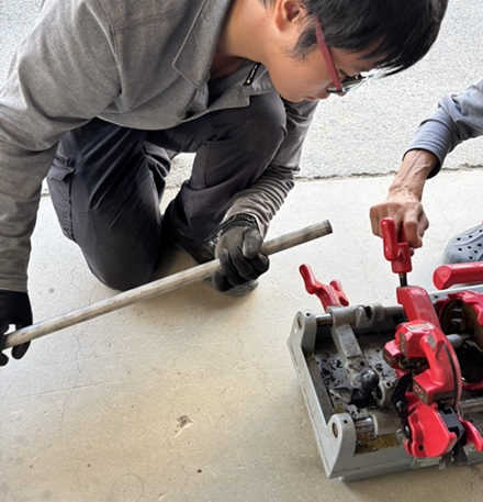本日の講習では、配管工事や設備施工に欠かせない工具である「ねじ切り機(パイプマシン)」の実習を行いました。