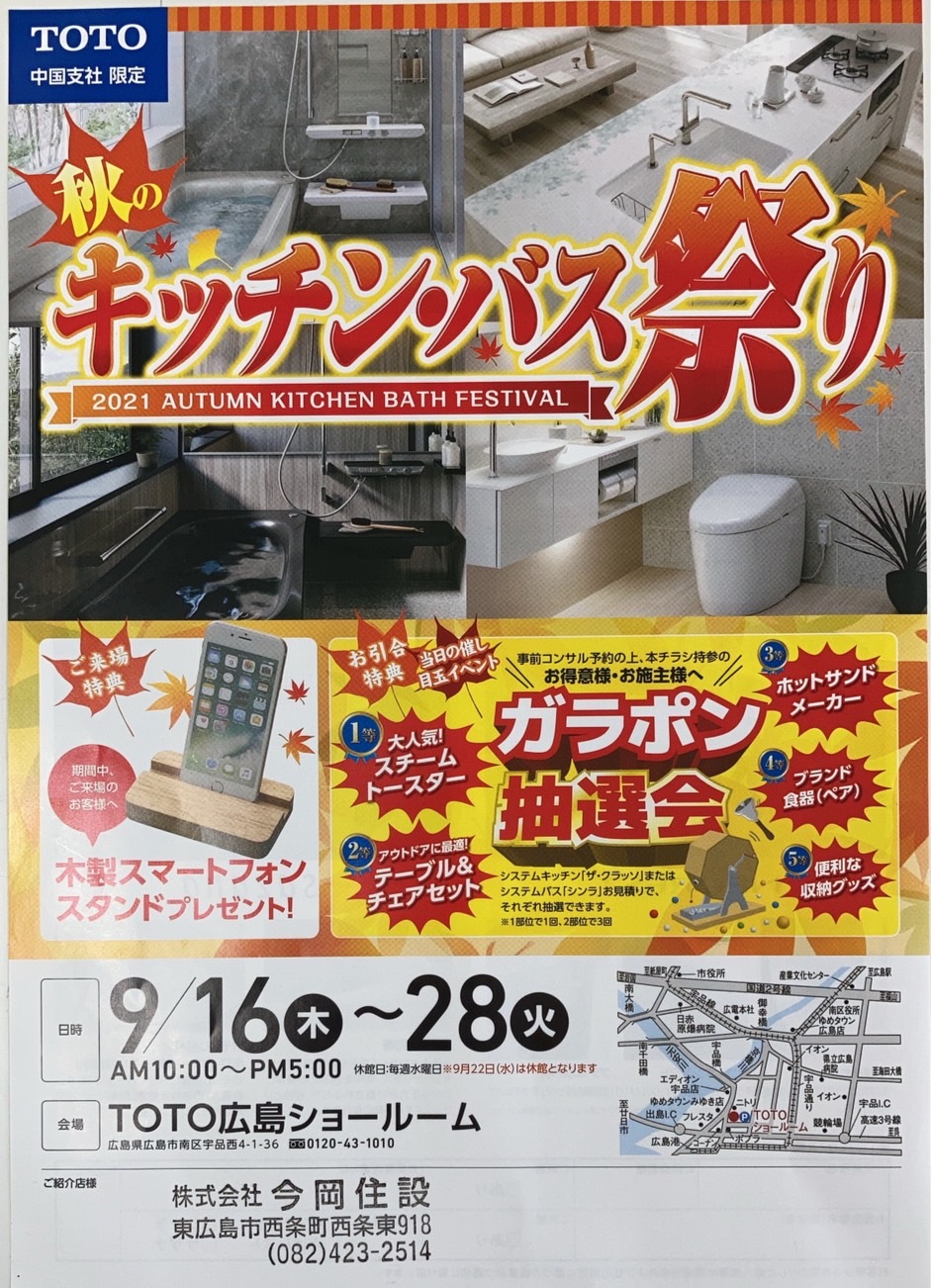9月16日~28日 TOTO広島ショールームにて秋のキッチン・バス祭りが開催されます。