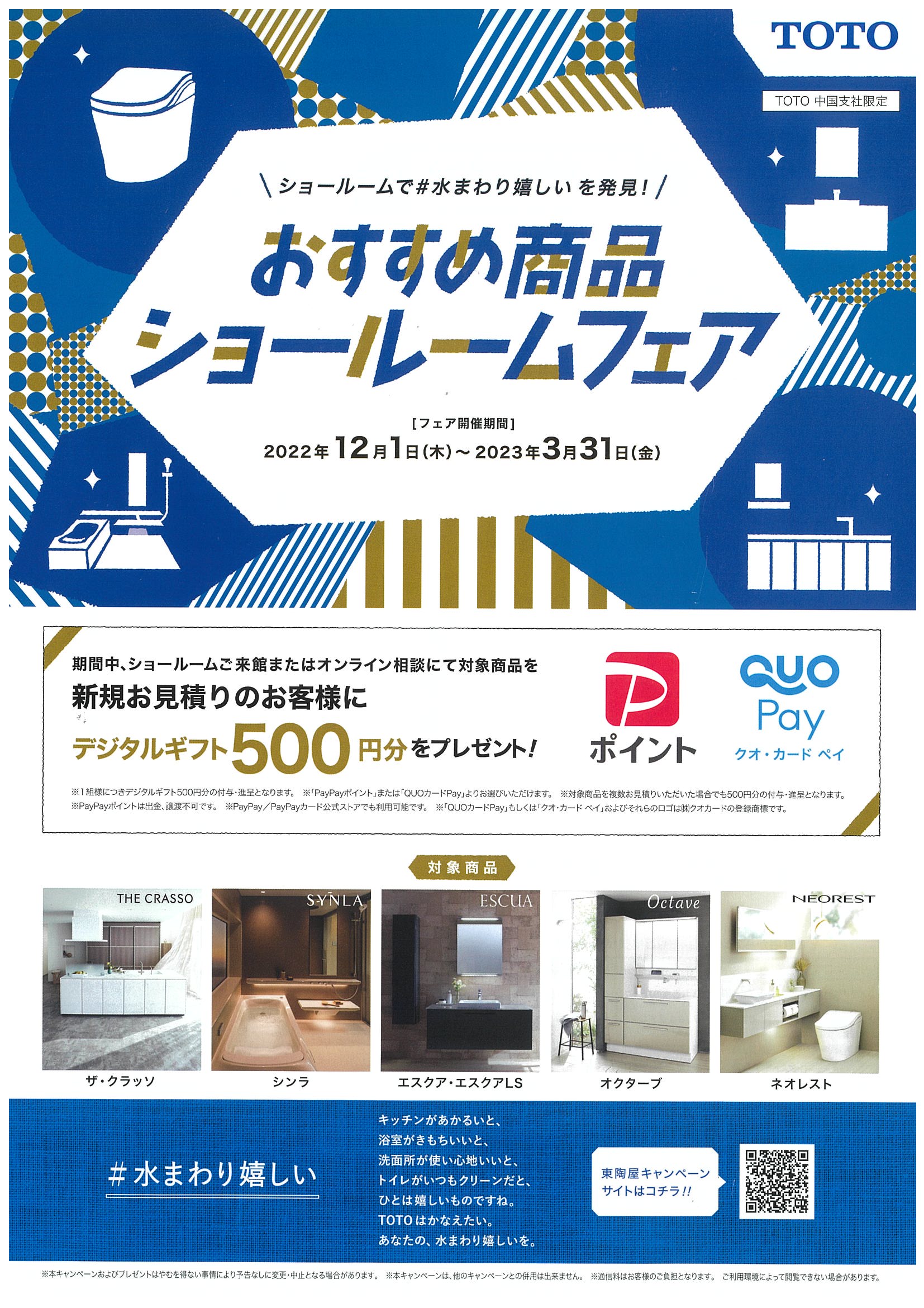 TOTO広島ショールームなどで、おすすめ商品ショールームフェアが開催されています